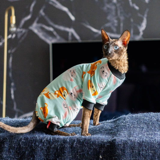 Our clothes are designed to follow the fluid movements of cats and let their skin breathe, without interfering with their litter box needs.