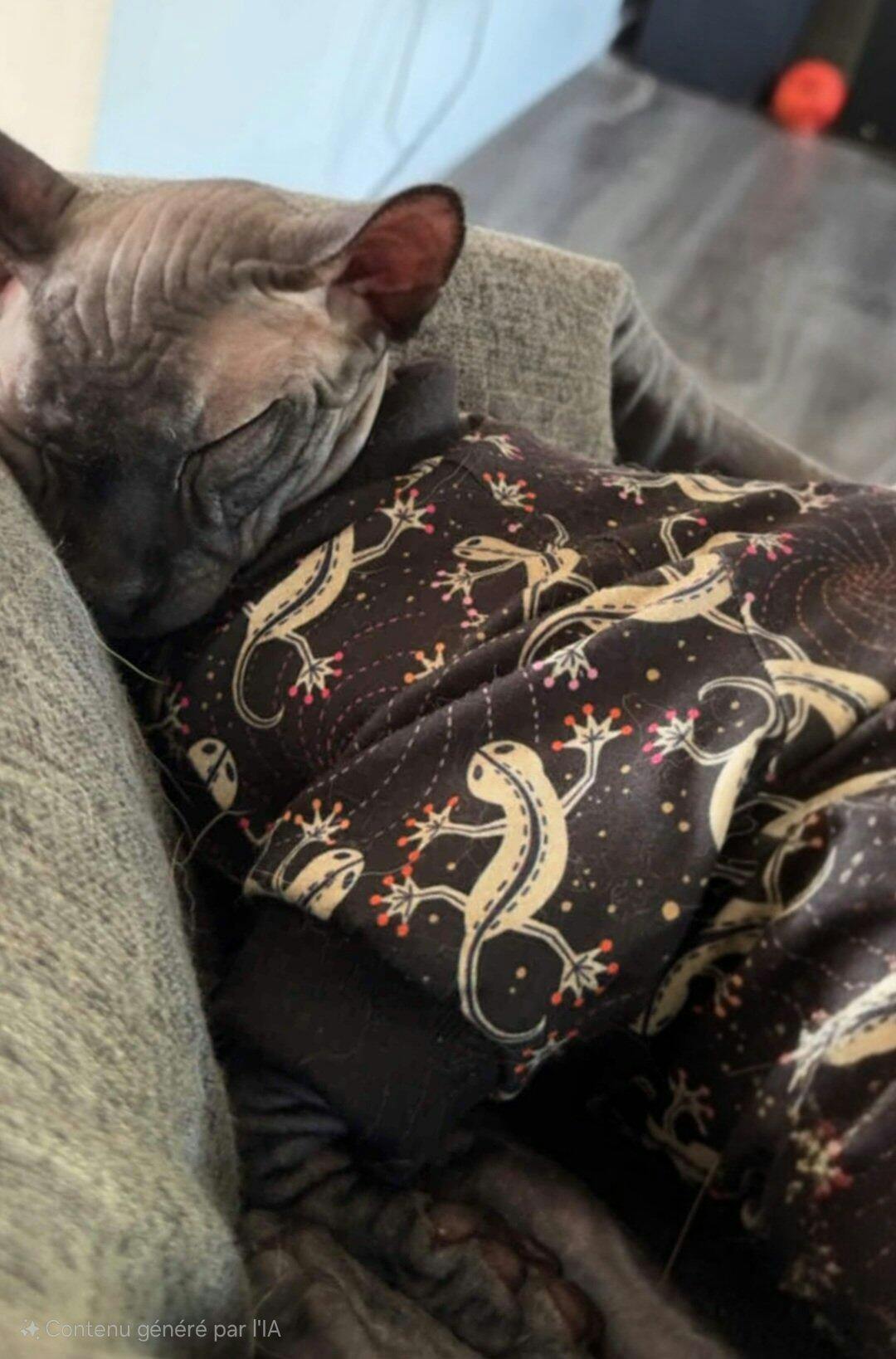 Designed to accommodate the fluid movements of cats, these pajamas allow the skin to breathe without interfering with litter box needs (the onesie should fit snugly lengthwise).